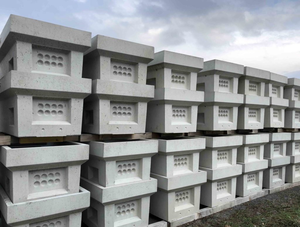 Différentes douilles sécables à collerette reçoivent autant les échelons à frapper que les axes de palonnier nécessaires au retournement de la chambre de tirage fraichement démoulée. Le programme BAEKELITE prévoit les anneaux de tirage et les supports d’équerres d’un design unique pour la série des chambres Telecom en béton.